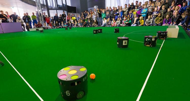 In de SSL is de strijd om de finaleplekken al beslist, en is het al bekend wie mogen gaan strijden om de gouden plak. Morgen om 13:00 zullen ER-Force en TIGERS Mannheim aantreden om te bepalen wie er kampioen wordt in de Small Size League. De vierde van de vier Senior leagues is de Middle Size League. Gisteren was het al bekend dat Tech United, CAMBADA en Carpe Noctem in de halve finales staan, en vandaag is ook duidelijk geworden wie de vierde plek heeft bemachtigd. De strijd om deze plek werd uitgevochten door ASML Falcons en VDL Robot Sports. De laatste wedstrijd van de dag, die veel toeschouwers trok, eindigde uiteindelijk in 4-1. Hiermee zijn de ASML Falcons dus ook geplaatst voor de halve finale, waarin ze het morgen mogen opnemen tegen Tech United. Toch waren er bij VDL Robot Sports ook blije gezichten te bespeuren, ze hebben namelijk hun eerste doelpunt van het toernooi gemaakt. De grote finalewedstrijd van morgen zal uiteindelijk gespeeld worden om 15:00, in de tent naast de koepel.